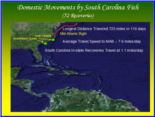 Fish tagged off South Carolina on the western side of the Gulf Stream have exhibited a much slower rate of northward travel than their Florida counterparts. The reason may be the presence of two intermittent gyres found on the western wall of the Gulf Stream off the Carolinas. Dolphin could enter these large rotating water masses and swim in circles for days, weeks or even months before exiting to continue their northward trek. Fish moving up the eastern side of the Stream would by-pass these obstacles and not be slowed in their northward movement.