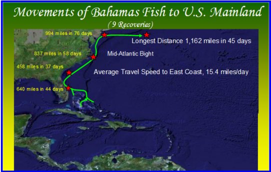 - These recoveries suggest the existence of migration routes that carry some portion of the U.S. East Coast stock throughout the Caribbean Sea while others may travel into the eastern North Atlantic.